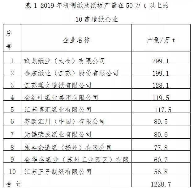2019年機(jī)制紙及紙板產(chǎn)量達(dá)到10萬t的造紙企業(yè)共20家,產(chǎn)量在50萬t以上的企業(yè)有10家(見表1)。