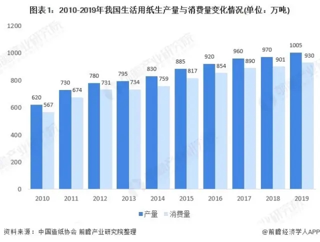 根據(jù)中國(guó)造紙協(xié)會(huì)在歷年《造紙工業(yè)年度報(bào)告》中披露的數(shù)據(jù),2010-2019年我國(guó)生活用紙的生產(chǎn)量與消費(fèi)量整體上呈現(xiàn)逐年增長(zhǎng)的態(tài)勢(shì)。2019年,我國(guó)生活用紙產(chǎn)量為1005萬(wàn)噸,較2018年增長(zhǎng)3.61%;消費(fèi)量為930萬(wàn)噸,較2018年增長(zhǎng)3.22%。