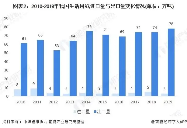 2010-2019年,我國(guó)生活用紙進(jìn)口數(shù)量較少,出口數(shù)量整體上呈現(xiàn)波動(dòng)增長(zhǎng)態(tài)勢(shì),出口量遠(yuǎn)高于進(jìn)口量。2019年,我國(guó)生活用紙進(jìn)口量為3萬(wàn)噸,較2018年減少了2萬(wàn)噸;出口量實(shí)現(xiàn)78萬(wàn)噸,較2018年增長(zhǎng)了4萬(wàn)噸。