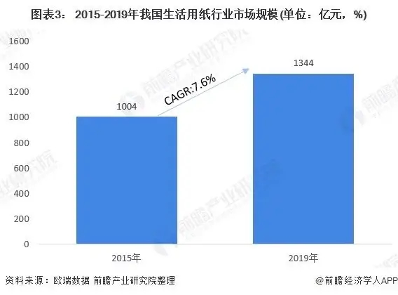 這一時(shí)期中國(guó)經(jīng)濟(jì)運(yùn)行總體平穩(wěn)、穩(wěn)中有進(jìn),中國(guó)生活用紙市場(chǎng)在此大背景下繼續(xù)保持穩(wěn)定增長(zhǎng),行業(yè)規(guī)模從2015年的1004億元人民幣,增長(zhǎng)到2019年的1344億元人民幣,CAGR為7.6%。