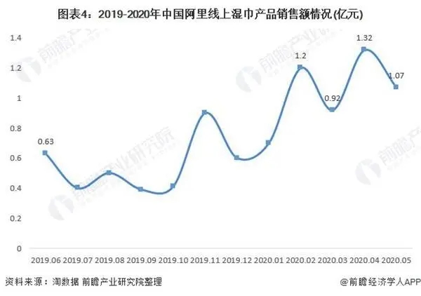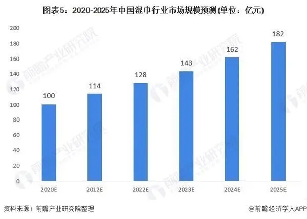 另一方面,2019年底全國疫情的爆發(fā)極大地刺激了濕巾的消費需求。2020年1-5月,阿里濕巾線上銷售額均在1億元左右,2020年4月銷售額更是高達1.32億元,2020年2月環(huán)比增速達到113.63%。此次“新冠疫情”較2003年非典更加嚴重,進一步激化了國人對衛(wèi)生健康的關(guān)注。同時,隨著我國經(jīng)濟積極向好,居民消費能力及意愿不斷提升,企業(yè)不斷探索制造多元化的濕巾,后疫情時代我國濕巾行業(yè)發(fā)展前景更為明朗,預計2025年市場規(guī)模有望達到182億元。