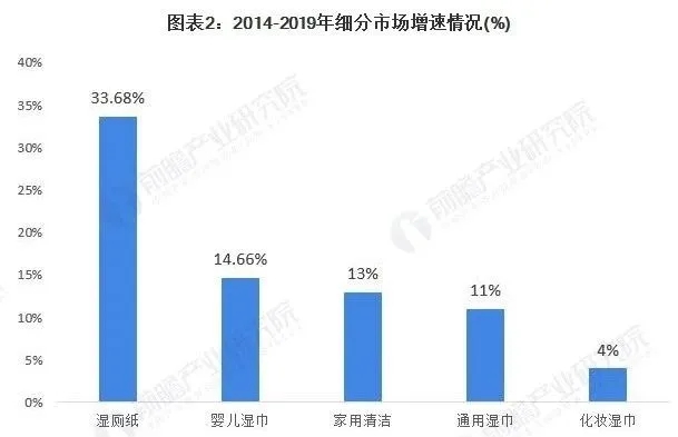 隨著我國(guó)人民個(gè)人衛(wèi)生意識(shí)的不斷提高,人們對(duì)濕巾的需求越來(lái)越大,對(duì)濕巾品類(lèi)和原料的要求也越來(lái)越高。因此濕巾品類(lèi)不斷豐富,出現(xiàn)更多具有較強(qiáng)針對(duì)性的產(chǎn)品,比如濕廁紙、嬰兒用紙、廚房濕巾、卸妝濕巾等。目前我國(guó)市場(chǎng)中嬰兒濕巾仍占據(jù)主要市場(chǎng)份額,但濕廁紙?jiān)鏊傺该?,高達(dá)33.68%,有望趕超嬰兒濕巾。