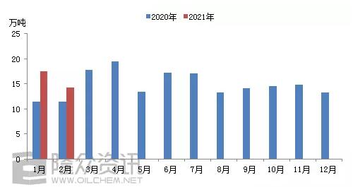 2020-2021年再生紙漿月度進口量