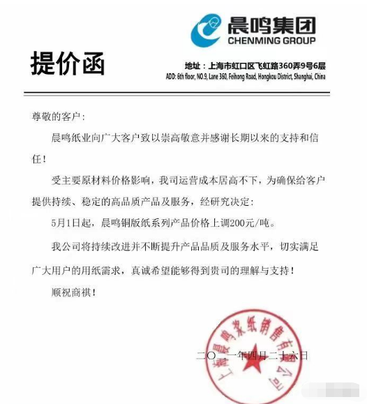 晨鳴紙業(yè):5月1日起,晨鳴銅版紙系列產(chǎn)品價格上調(diào)200元/噸。