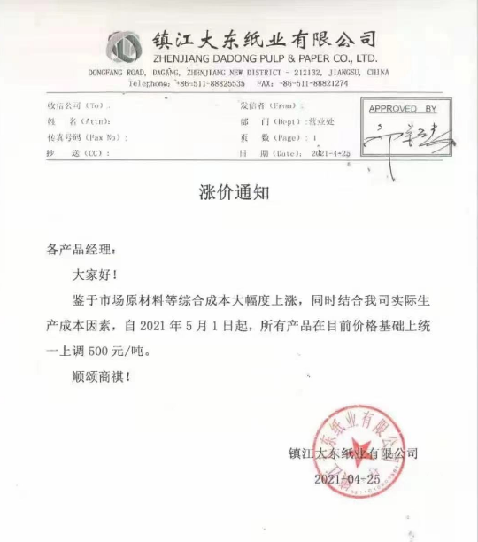 大東紙業(yè):5月1日起,所有產(chǎn)品在目前價格基礎(chǔ)上統(tǒng)一上調(diào)500元/噸。