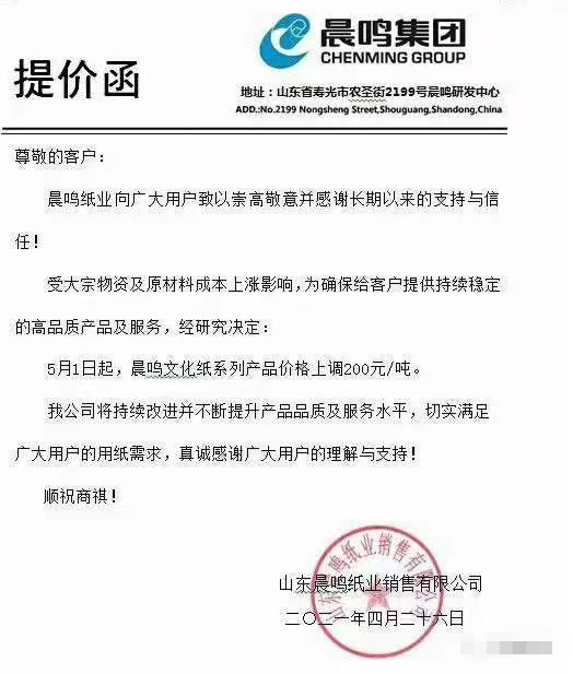 晨鳴紙業(yè):5月1日起,晨鳴文化紙系列產(chǎn)品價格上調(diào)200元/噸。