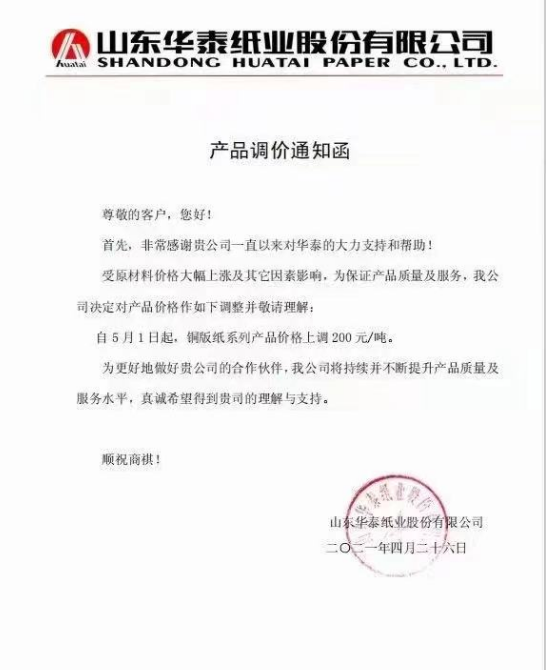 華泰紙業(yè):5月1日起,銅版紙系列產(chǎn)品價格上調(diào)200元/噸。
