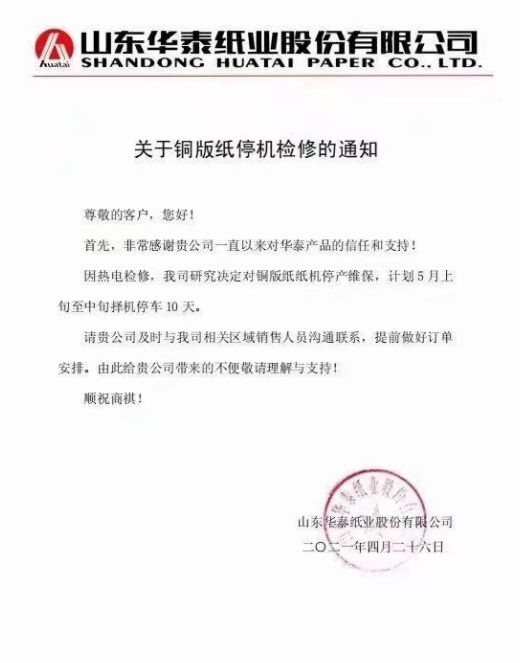 華泰紙業(yè):因熱點檢修,我司研究決定對銅版紙紙機停產(chǎn)維保,計劃5月上旬至中旬擇機停車10天。