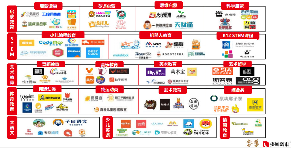 從素質(zhì)教育細(xì)分賽道典型公司來看,產(chǎn)品類型覆蓋啟蒙教育、藝術(shù)教育、早幼教平臺、少兒編程教育、情商教育等。