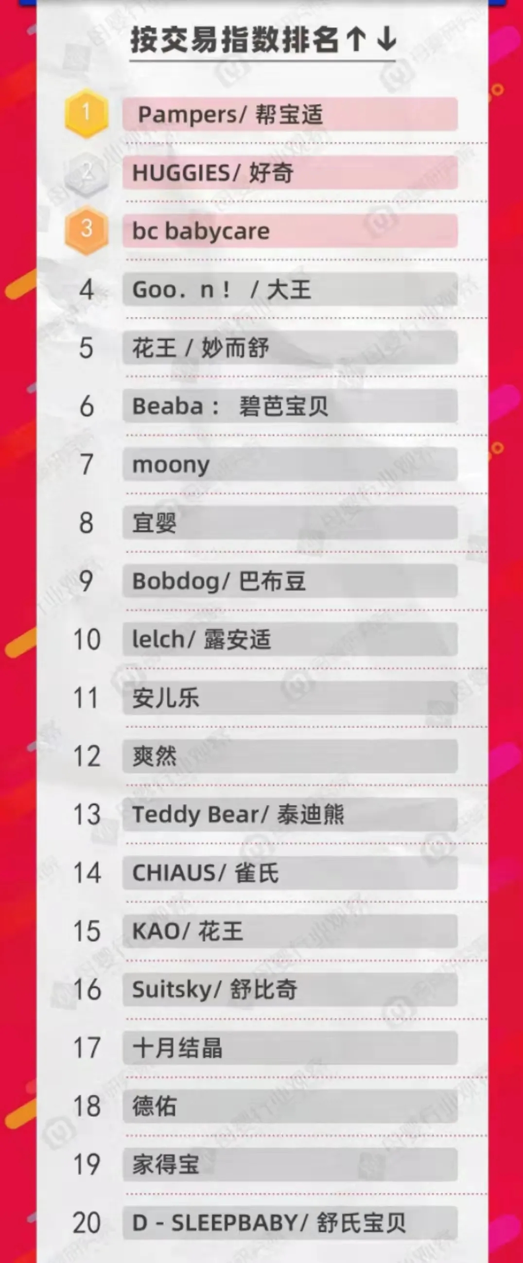 2021年10月20日晚8點(diǎn),天貓雙十一預(yù)售正式開(kāi)啟,截止到11月11日9:00,天貓雙十一紙尿褲排名榜單TOP20出爐。