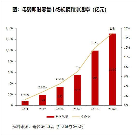年輕母嬰用戶對于“即時性”“便捷化”的追求,推動母嬰即時零售渠道的狀態(tài),截止2022年該渠道規(guī)模約194億元,預計2026年將達1305億元,年復合增長74%,勢頭尤為猛烈。