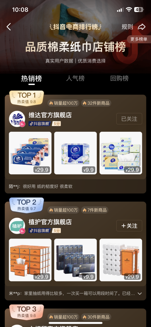 以生活用紙品牌維達(dá)為例,截至2023年7月25日,據(jù)抖音平臺直播動態(tài)顯示,維達(dá)官方旗艦店今年上半年累計直播場次已超過200場。從最新的抖音電商排行榜來看,維達(dá)官方旗艦店已經(jīng)在“品質(zhì)綿柔紙巾店鋪熱銷榜”上排名第一。而店內(nèi)居銷量榜首的爆品手帕紙更是售出達(dá)到253.6萬件。其中排名前五的品類分別為手帕紙、卷芯紙和抽紙,手帕紙獨占前三名。